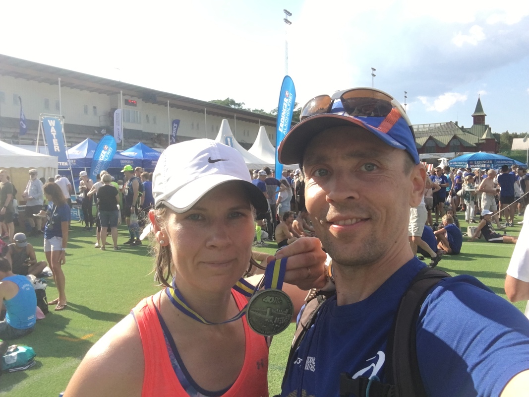 Omalta osalta juoksu meni ihan kohtalaisesti, 7 minuuttia jäin ennätyksestä, joka muuten olisi lienee ollut saavutettavissa. Keväällä on kuitenkin tullut nakuteltua sekä 10 km että ½ maran omat ennätykset. Olosuhteet kuitenkin tekivät selväksi jo heti alussa, että ennätystä on turha tavoitella, puoleen väliin asti kuitenkin pystyin pitämään omaa hyvää vauhtia. Tämän jälkeen alkoi tasainen hiipuminen, energiaa kyllä oli, eikä mitään vaivoja ilmaantunut, mutta kuumuus vaan vei menohalut. 33 km kohdalla Västerbron:n silta tuntui loputtomalta. Täkäläisittäin tuota voinee verrata noin 10 x Väinölän sillan nousua putkeen. Toisaalta perheemme parempi puolisko osoitti, että hellemaran voi juosta myös järkevästi, Maaritin ensimmäinen täysimatka aikaan 4:26 ja loppua kohti kiihtyvänä! Maaliin saapui hymyilevä juoksija pirteänä kuin peipponen! Toipumisalue ja siellä jälkihuolto oli myös loistava, taisin kiskaista 4 tuoppia alkoholitonta olutta, pari hodaria, kahvia, pullaa jne. Kentällä tekonurmella pötkötellessä oli kiva jutella ihmisten kanssa ja seurata maaliin valuvaa ihmismassaa. |
