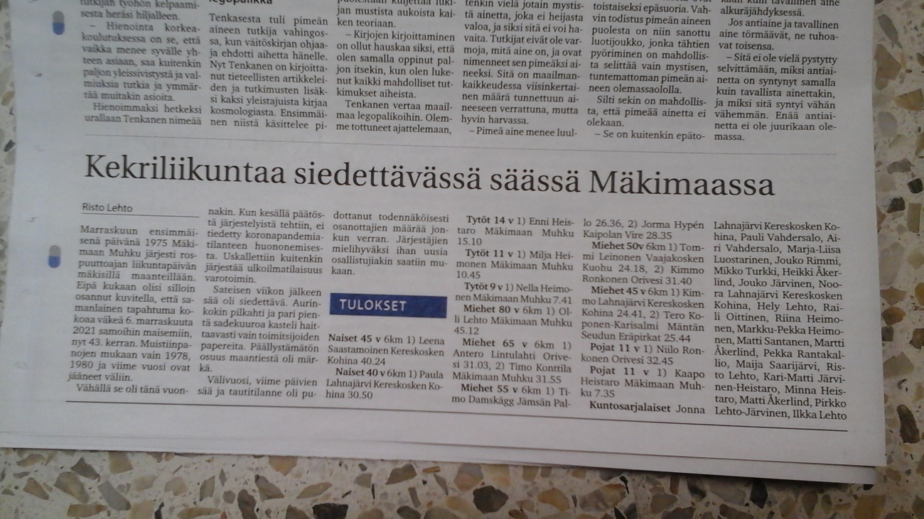 Lauantaina koettiin juoksujuhlaa Kuohun päättäjäisten lisäksi Sarvimaratonilla Loviisassa ja Kekrijuoksussa Kuhmoisissa. Sarvimaratonilla Mr.Puolimaraton eli Timppa kävi taas nappaamassa pytyn hyllyyn, ollen kolmas. Juoksu oli tällä kertaa enemmän treenimuotoinen ja maisemien katselua. Hyvä niin , miksi mennä täysiä jos pintakaasukin riittää. Tulokset. Kekrijuoksu juostiin pienessä Mäkimaan kylässä Kuhmoisen kunnassa. Tommi tinttasi M50 sarjan piikkipaikan. Tulokset viereisessä kuvassa (klikkaamalla saat kuvan isommaksi). Hyvä ukot, kauden alkuunkin näyttää kenkä olevan syönnillään.