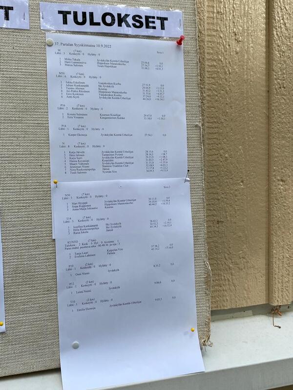 Syyskuun toisena lauantaina kuohulaisista kisarintamalla olivat Niina, Jukka ja Eero. Niina kävi kipaisemassa Tallinnassa puolikkaan, varsin hyvää aikaan 1.45,20. Tällä irtosi sija 15 N40-sarjassa. Hyvä Niina. Jukka ja Eero kävisvät juoksemassa Jämsän Partalassa paikallisen kirmaisun. 7 km pituisessa hölkässä ukot sijoittuivat M50-sarjassa sijoille yksi ja viisi. Tulokset kuvan muodossa vieressä. |